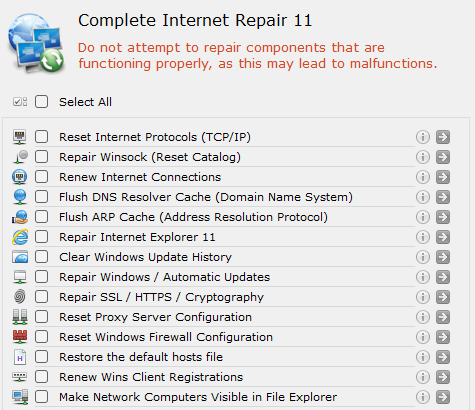 بەرنامەی ( 11 Complete Internet Repair ) بەرنامەیکی زۆر چاکە کاری بەرنامەکە بریتیە لە چارەسەر کردنی زۆربەی کێشەکانی ئینتەرنێت وەک ( Reset ) کردن و چارەسەر کردنی کێشەکان و لە کاتی نەبوونی ئینتەرنێت یان باش کارنەکردنی ئینتەرنێت یان هەر کێشەیەکی تر ( Network )، هەروەک لە وێنەکەدا دیارە.