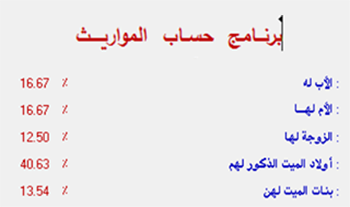 بەرنامەی ( حساب المواريث ) بەرنامەیەکی ئیسلامیە زۆر چاکە تایبەتە بە دابەش کردنی میرات کە بەرنامەکە بە زمانی عربی و ئینگلیزیە کە سەرەتا دەبێت ئەو زانیاریانە داخڵ بکەیت کە پەیوەندی بە میراتی کۆچ کردووەکە و ئەو کەسانەی کە پەیوەندیان بە کۆچ کردووەکە هەیە داخڵ بکەیت باش داخڵ کردنی زانیاریەکان بە رێکی، بەرنامەکە زانیاریت دەداتێ دەربارەی رێژەی دابەشکردنی میراتەکە بۆ هەریەکێک لە ئەندامانی کۆچ کردووەکە.